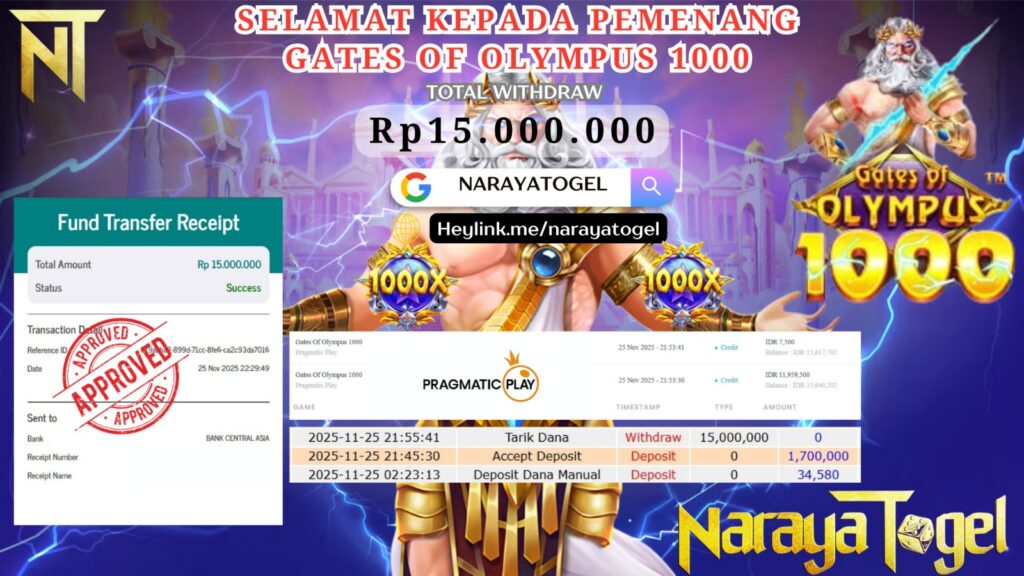 Selamat kepada User id GENM**** Telah berhasil mendapatkan kemenangan besar pada permainan SLOT GATES OF OLYMPUS 1000 Dengan kemenangan Sebesar Rp 15.000.000 Setelah mengisi formulir withdraw dengan kurang waktu hanya 1 – 10 menit pihak NARAYATOGEL sudah melakukan transfer kepada pemiliknya dan dana sudah masuk ke rekening id tersebut oleh pemenang. Bukti pembayaran yang kami berikan merupakan bukti pembayaran yang SAH / VALID yang langsung di dapatkan melalui tanda transfer transaksi berhasil dari Bank yang di tuju.