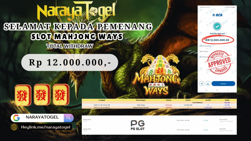 Selamat kepada User id FUI**** Telah berhasil mendapatkan kemenangan besar pada permainan SLOT MAHJONG WAYS Dengan kemenangan Sebesar Rp 12.000.000 Setelah mengisi formulir withdraw dengan kurang waktu hanya 1 – 10 menit pihak NARAYATOGEL sudah melakukan transfer kepada pemiliknya dan dana sudah masuk ke rekening id tersebut oleh pemenang. Bukti pembayaran yang kami berikan merupakan bukti pembayaran yang SAH / VALID yang langsung di dapatkan melalui tanda transfer transaksi berhasil dari Bank yang di tuju.