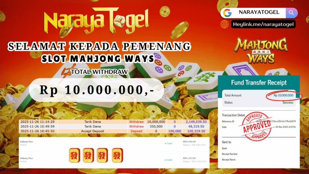 Selamat kepada User id FOP**** Telah berhasil mendapatkan kemenangan besar pada permainan SLOT MAHJONG WAYS Dengan kemenangan Sebesar Rp 10.000.000 Setelah mengisi formulir withdraw dengan kurang waktu hanya 1 – 10 menit pihak NARAYATOGEL sudah melakukan transfer kepada pemiliknya dan dana sudah masuk ke rekening id tersebut oleh pemenang. Bukti pembayaran yang kami berikan merupakan bukti pembayaran yang SAH / VALID yang langsung di dapatkan melalui tanda transfer transaksi berhasil dari Bank yang di tuju.