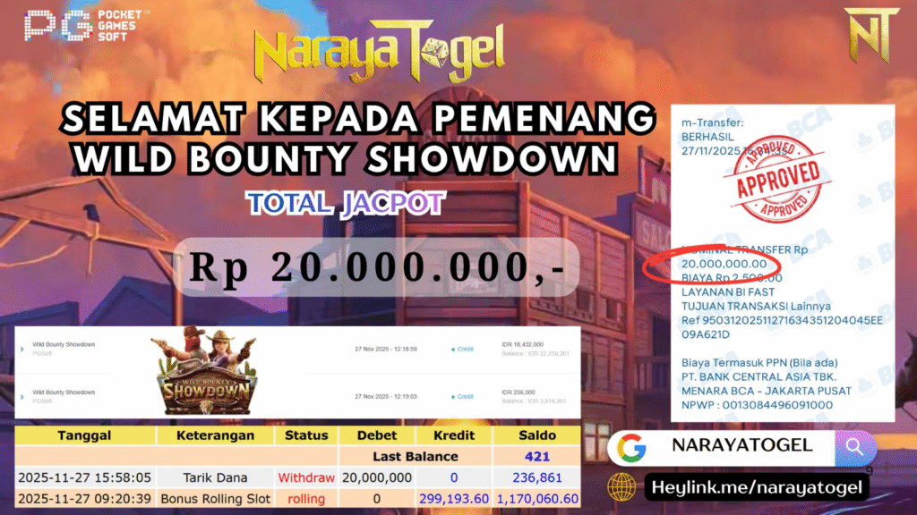 Selamat kepada User id wew**** Telah berhasil mendapatkan kemenangan besar pada permainan WILD BOUNTY SHOWDOWN Dengan kemenangan Sebesar Rp 20.000.000 Setelah mengisi formulir withdraw dengan kurang waktu hanya 1 – 10 menit pihak NARAYATOGEL sudah melakukan transfer kepada pemiliknya dan dana sudah masuk ke rekening id tersebut oleh pemenang. Bukti pembayaran yang kami berikan merupakan bukti pembayaran yang SAH / VALID yang langsung di dapatkan melalui tanda transfer transaksi berhasil dari Bank yang di tuju.