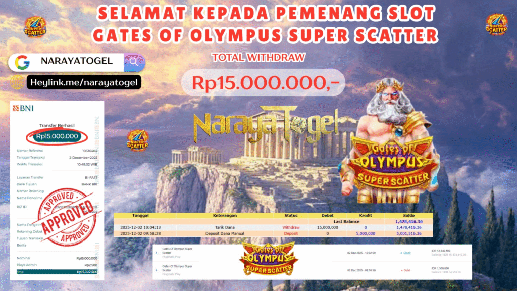 Selamat kepada User id FOP*** Telah berhasil mendapatkan kemenangan besar pada permainan SLOT GATES OF OLYMPUS SUPER SCATTER Dengan kemenangan Sebesar Rp 15.000.000 Setelah mengisi formulir withdraw dengan kurang waktu hanya 1 – 10 menit pihak NARAYATOGEL sudah melakukan transfer kepada pemiliknya dan dana sudah masuk ke rekening id tersebut oleh pemenang. Bukti pembayaran yang kami berikan merupakan bukti pembayaran yang SAH / VALID yang langsung di dapatkan melalui tanda transfer transaksi berhasil dari Bank yang di tuju.