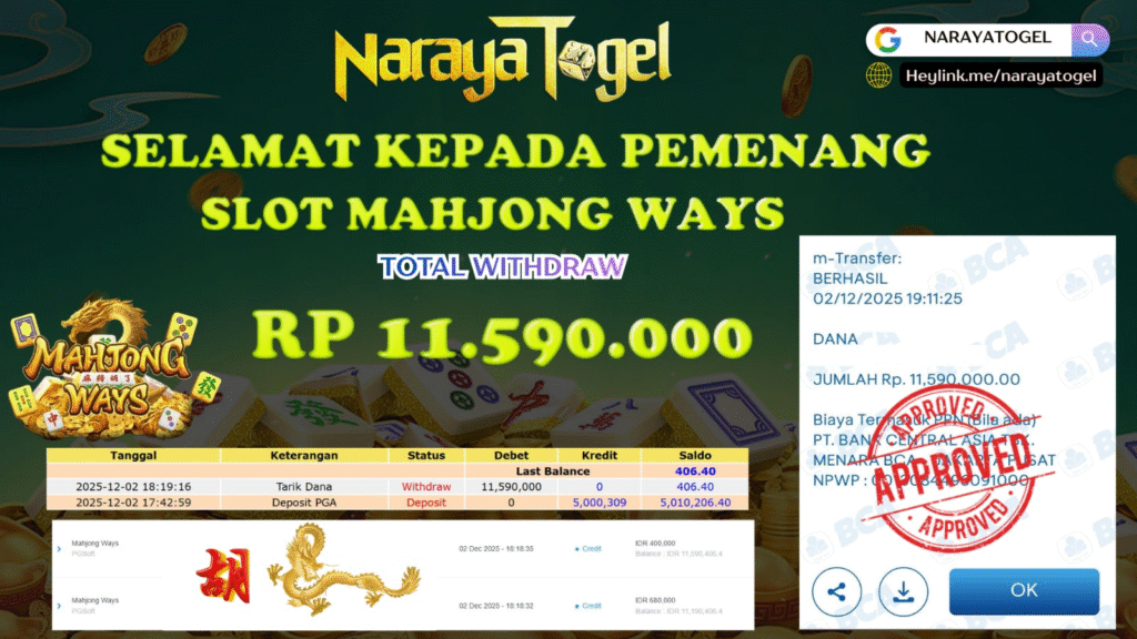 Selamat kepada User id sese*** Telah berhasil mendapatkan kemenangan besar pada permainan SLOT MAHJONG WAYS    Dengan kemenangan Sebesar  Rp 11.590.000 Setelah mengisi formulir withdraw dengan kurang waktu hanya 1 – 10 menit pihak NARAYATOGEL sudah melakukan transfer kepada pemiliknya dan dana sudah masuk ke rekening id tersebut oleh pemenang. Bukti pembayaran yang kami berikan merupakan bukti pembayaran yang SAH / VALID yang langsung di dapatkan melalui tanda transfer transaksi berhasil dari Bank yang di tuju.