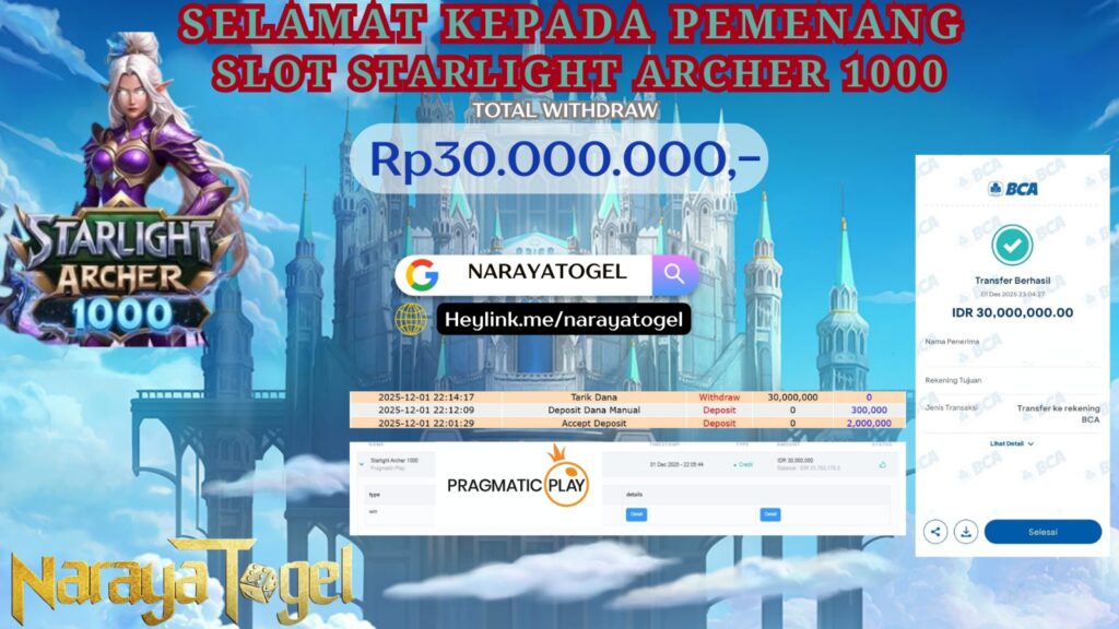 Selamat kepada User id JPYA**** Telah berhasil mendapatkan kemenangan besar pada permainan SLOT STARLGHT ARCHER Dengan kemenangan Sebesar Rp 30.000.000 Setelah mengisi formulir withdraw dengan kurang waktu hanya 1 – 10 menit pihak NARAYATOGEL sudah melakukan transfer kepada pemiliknya dan dana sudah masuk ke rekening id tersebut oleh pemenang. Bukti pembayaran yang kami berikan merupakan bukti pembayaran yang SAH / VALID yang langsung di dapatkan melalui tanda transfer transaksi berhasil dari Bank yang di tuju.