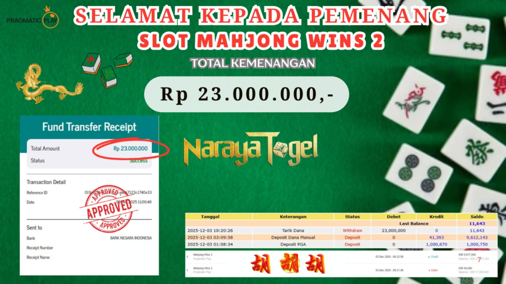 Selamat kepada User id sese*** Telah berhasil mendapatkan kemenangan besar pada permainan SLOT MAHJONG WINS 2    Dengan kemenangan Sebesar  Rp 23.000.000 Setelah mengisi formulir withdraw dengan kurang waktu hanya 1 – 10 menit pihak NARAYATOGEL sudah melakukan transfer kepada pemiliknya dan dana sudah masuk ke rekening id tersebut oleh pemenang. Bukti pembayaran yang kami berikan merupakan bukti pembayaran yang SAH / VALID yang langsung di dapatkan melalui tanda transfer transaksi berhasil dari Bank yang di tuju.