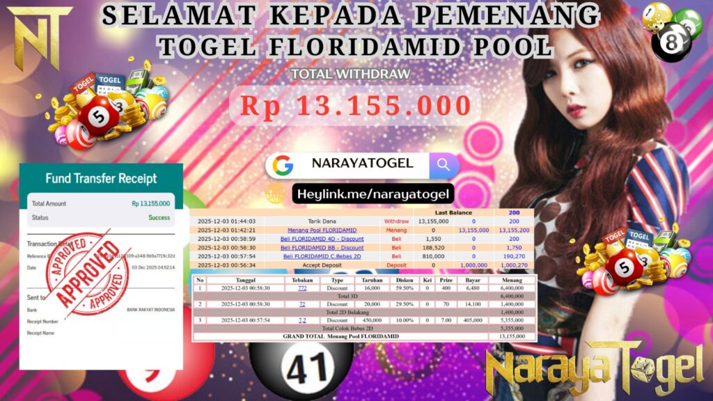 Selamat kepada User id MAN*** Telah berhasil mendapatkan kemenangan besar pada permainan TOGEL FLORIDAMID    Dengan kemenangan Sebesar  Rp13.155.000 Setelah mengisi formulir withdraw dengan kurang waktu hanya 1 – 10 menit pihak NARAYATOGEL sudah melakukan transfer kepada pemiliknya dan dana sudah masuk ke rekening id tersebut oleh pemenang. Bukti pembayaran yang kami berikan merupakan bukti pembayaran yang SAH / VALID yang langsung di dapatkan melalui tanda transfer transaksi berhasil dari Bank yang di tuju.