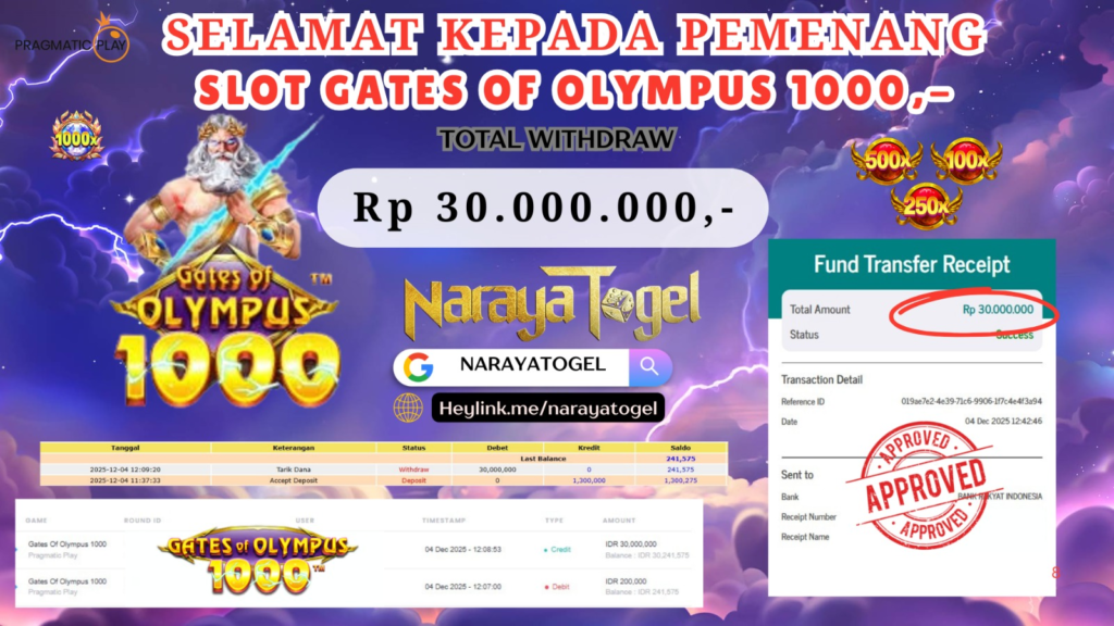 Selamat kepada User id VOP*** Telah berhasil mendapatkan kemenangan besar pada permainan SLOT GATES OF OLYMPUS 1000 Dengan kemenangan Sebesar Rp 30.000.000 Setelah mengisi formulir withdraw dengan kurang waktu hanya 1 – 10 menit pihak NARAYATOGEL sudah melakukan transfer kepada pemiliknya dan dana sudah masuk ke rekening id tersebut oleh pemenang. Bukti pembayaran yang kami berikan merupakan bukti pembayaran yang SAH / VALID yang langsung di dapatkan melalui tanda transfer transaksi berhasil dari Bank yang di tuju.
