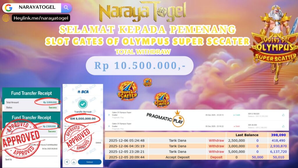 Selamat kepada User id GAGA**** Telah berhasil mendapatkan kemenangan besar pada permainan SLOT GATES OF OLYMPUS SUPER SCATTER Dengan kemenangan Sebesar Rp 10.500.000 Setelah mengisi formulir withdraw dengan kurang waktu hanya 1 – 10 menit pihak NARAYATOGEL sudah melakukan transfer kepada pemiliknya dan dana sudah masuk ke rekening id tersebut oleh pemenang. Bukti pembayaran yang kami berikan merupakan bukti pembayaran yang SAH / VALID yang langsung di dapatkan melalui tanda transfer transaksi berhasil dari Bank yang di tuju.