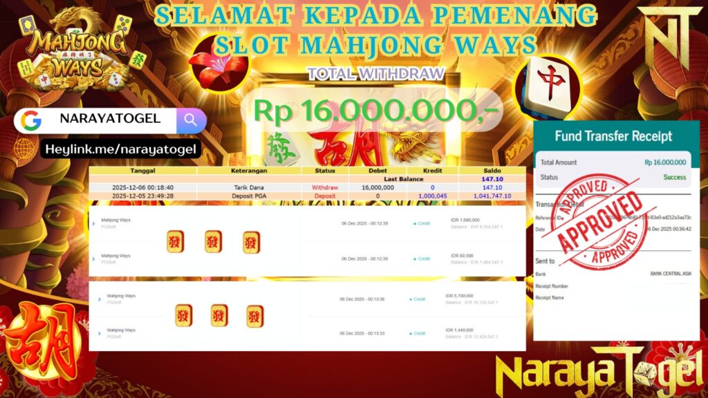 Selamat kepada User id dew**** Telah berhasil mendapatkan kemenangan besar pada permainan MAHJONG WAYS    Dengan kemenangan Sebesar  Rp 16.000.000 Setelah mengisi formulir withdraw dengan kurang waktu hanya 1 – 10 menit pihak NARAYATOGEL sudah melakukan transfer kepada pemiliknya dan dana sudah masuk ke rekening id tersebut oleh pemenang. Bukti pembayaran yang kami berikan merupakan bukti pembayaran yang SAH / VALID yang langsung di dapatkan melalui tanda transfer transaksi berhasil dari Bank yang di tuju.