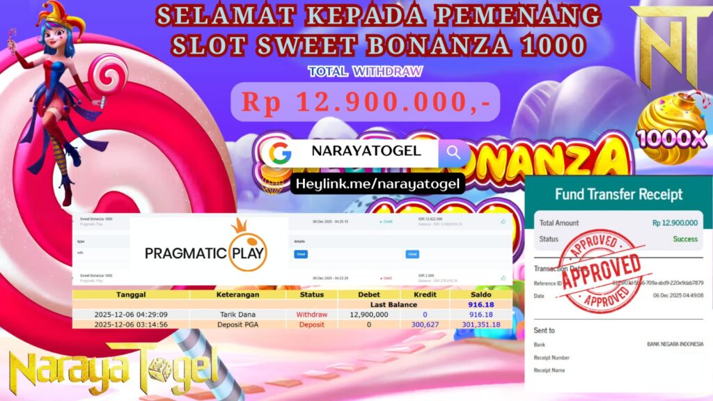Selamat kepada User id MADU**** Telah berhasil mendapatkan kemenangan besar pada permainan SLOT SWEET BONANZA1000 Dengan kemenangan Sebesar Rp 12.900.000 Setelah mengisi formulir withdraw dengan kurang waktu hanya 1 – 10 menit pihak NARAYATOGEL sudah melakukan transfer kepada pemiliknya dan dana sudah masuk ke rekening id tersebut oleh pemenang. Bukti pembayaran yang kami berikan merupakan bukti pembayaran yang SAH / VALID yang langsung di dapatkan melalui tanda transfer transaksi berhasil dari Bank yang di tuju.