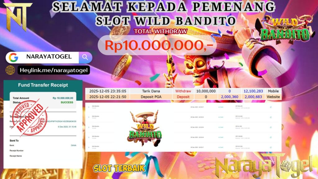 Selamat kepada User id SYA**** Telah berhasil mendapatkan kemenangan besar pada permainan SLOT WILD BANDITO    Dengan kemenangan Sebesar  Rp10.000.000 Setelah mengisi formulir withdraw dengan kurang waktu hanya 1 – 10 menit pihak NARAYATOGEL sudah melakukan transfer kepada pemiliknya dan dana sudah masuk ke rekening id tersebut oleh pemenang. Bukti pembayaran yang kami berikan merupakan bukti pembayaran yang SAH / VALID yang langsung di dapatkan melalui tanda transfer transaksi berhasil dari Bank yang di tuju.