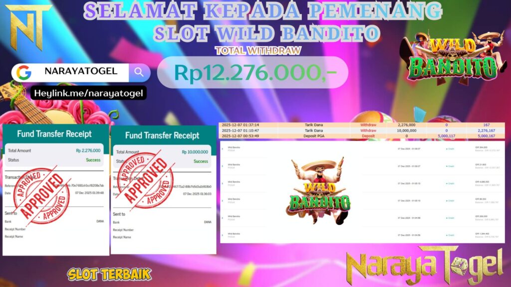 Selamat kepada User id SUR**** Telah berhasil mendapatkan kemenangan besar pada permainan WILD BANDITO Dengan kemenangan Sebesar Rp 12.276.000 Setelah mengisi formulir withdraw dengan kurang waktu hanya 1 – 10 menit pihak NARAYATOGEL sudah melakukan transfer kepada pemiliknya dan dana sudah masuk ke rekening id tersebut oleh pemenang. Bukti pembayaran yang kami berikan merupakan bukti pembayaran yang SAH / VALID yang langsung di dapatkan melalui tanda transfer transaksi berhasil dari Bank yang di tuju.