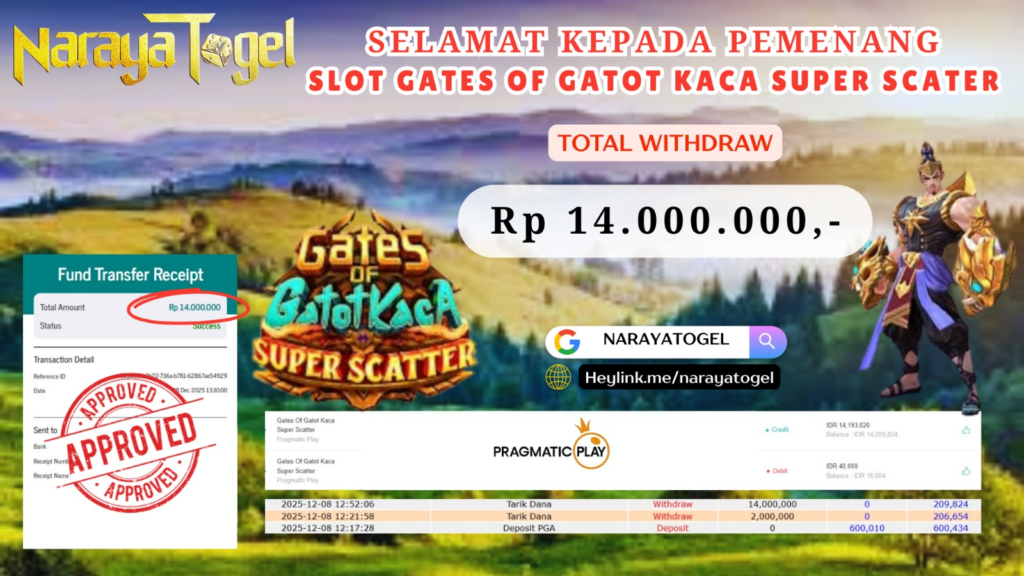 Selamat kepada User id FER**** Telah berhasil mendapatkan kemenangan besar pada permainan SLOT GATES OF GATOT KACA SUPER SCATER Dengan kemenangan Sebesar Rp 14.000.000 Setelah mengisi formulir withdraw dengan kurang waktu hanya 1 – 10 menit pihak NARAYATOGEL sudah melakukan transfer kepada pemiliknya dan dana sudah masuk ke rekening id tersebut oleh pemenang. Bukti pembayaran yang kami berikan merupakan bukti pembayaran yang SAH / VALID yang langsung di dapatkan melalui tanda transfer transaksi berhasil dari Bank yang di tuju.
