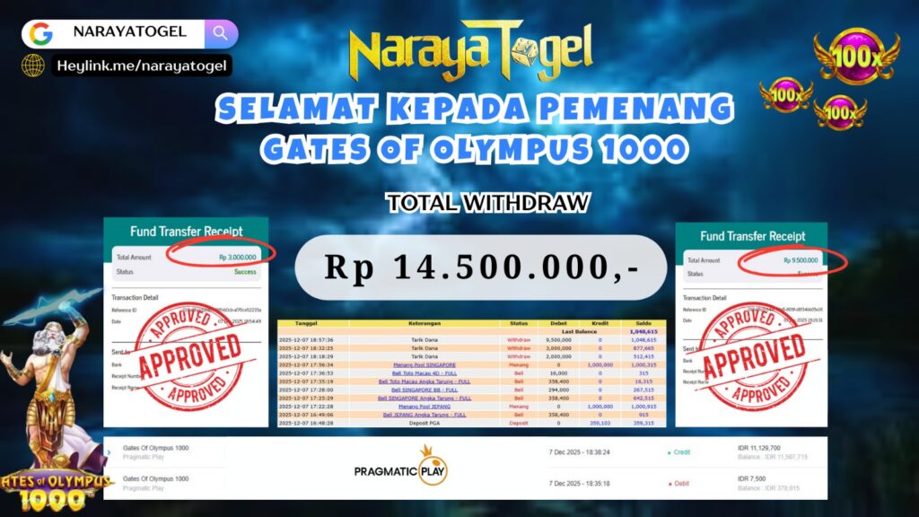 Selamat kepada User id DAU**** Telah berhasil mendapatkan kemenangan besar pada permainan SLOT GATES OF OLYMPUS 1000 Dengan kemenangan Sebesar Rp 14.500.000 Setelah mengisi formulir withdraw dengan kurang waktu hanya 1 – 10 menit pihak NARAYATOGEL sudah melakukan transfer kepada pemiliknya dan dana sudah masuk ke rekening id tersebut oleh pemenang. Bukti pembayaran yang kami berikan merupakan bukti pembayaran yang SAH / VALID yang langsung di dapatkan melalui tanda transfer transaksi berhasil dari Bank yang di tuju.