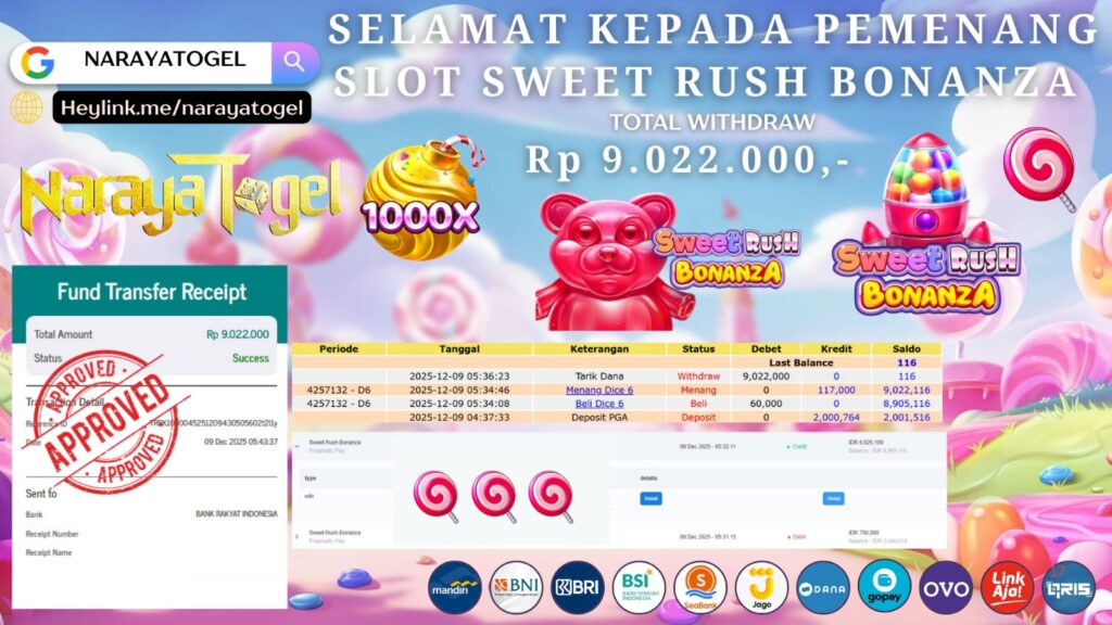 Selamat kepada User id KON**** Telah berhasil mendapatkan kemenangan besar pada permainan SWEET RUSH BONANZA Dengan kemenangan Sebesar Rp 9.022.000 Setelah mengisi formulir withdraw dengan kurang waktu hanya 1 – 10 menit pihak NARAYATOGEL sudah melakukan transfer kepada pemiliknya dan dana sudah masuk ke rekening id tersebut oleh pemenang. Bukti pembayaran yang kami berikan merupakan bukti pembayaran yang SAH / VALID yang langsung di dapatkan melalui tanda transfer transaksi berhasil dari Bank yang di tuju.