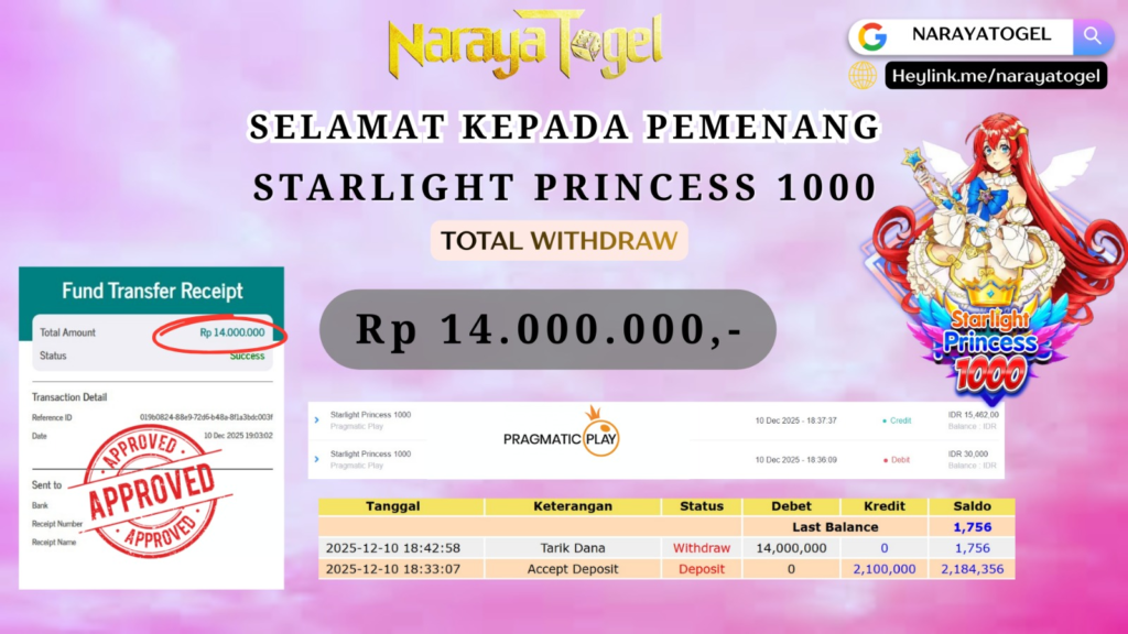 Selamat kepada User id DQO**** Telah berhasil mendapatkan kemenangan besar pada permainanSTARLIGHT PRINCESS 1000 , Dengan kemenangan Sebesar Rp 14.000.000 Setelah mengisi formulir withdraw dengan kurang waktu hanya 1 – 10 menit pihak NARAYATOGEL sudah melakukan transfer kepada pemiliknya dan dana sudah masuk ke rekening id tersebut oleh pemenang. Bukti pembayaran yang kami berikan merupakan bukti pembayaran yang SAH / VALID yang langsung di dapatkan melalui tanda transfer transaksi berhasil dari Bank yang di tuju.