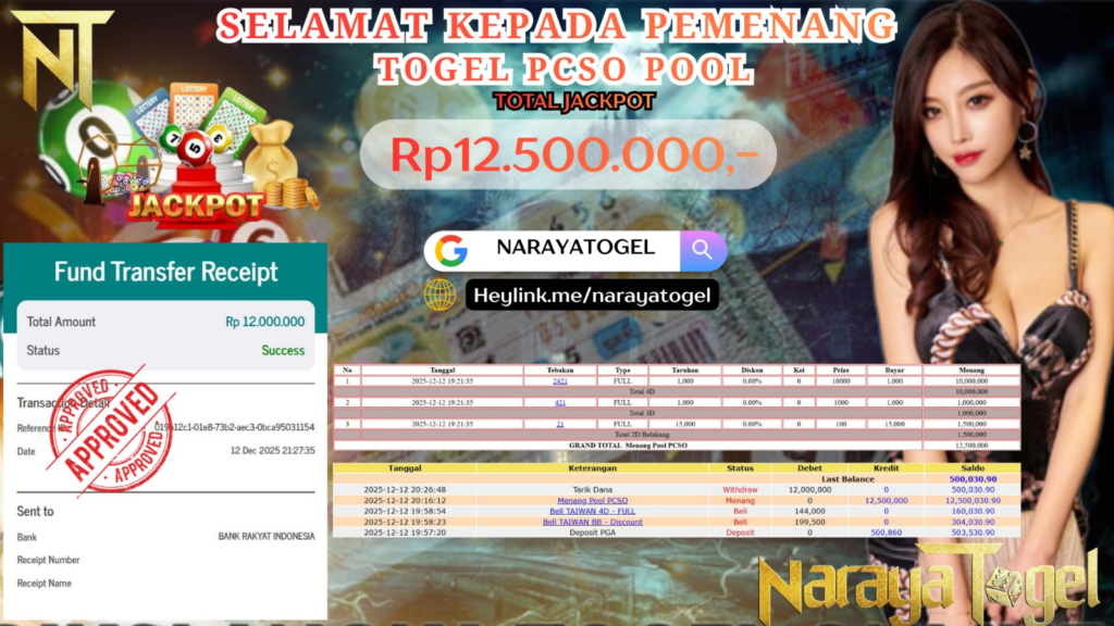 Selamat kepada User id RUK**** Telah berhasil mendapatkan kemenangan besar pada permainan TOGEL PCSO Dengan kemenangan Sebesar Rp12.500.000 Setelah mengisi formulir withdraw dengan kurang waktu hanya 1 – 10 menit pihak NARAYATOGEL sudah melakukan transfer kepada pemiliknya dan dana sudah masuk ke rekening id tersebut oleh pemenang. Bukti pembayaran yang kami berikan merupakan bukti pembayaran yang SAH / VALID yang langsung di dapatkan melalui tanda transfer transaksi berhasil dari Bank yang di tuju.