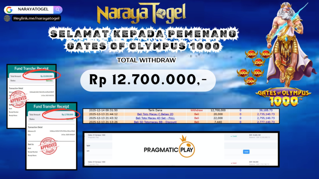Selamat kepada User id REG**** Telah berhasil mendapatkan kemenangan besar pada permainan GATES OF OLYMPUS 1000 Dengan kemenangan Sebesar Rp 12.700.000 Setelah mengisi formulir withdraw dengan kurang waktu hanya 1 – 10 menit pihak NARAYATOGEL sudah melakukan transfer kepada pemiliknya dan dana sudah masuk ke rekening id tersebut oleh pemenang. Bukti pembayaran yang kami berikan merupakan bukti pembayaran yang SAH / VALID yang langsung di dapatkan melalui tanda transfer transaksi berhasil dari Bank yang di tuju.