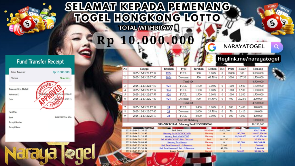 Masih ragu dengan NARAYA TOGEL bos ? Di mana bandar togel online sekarang yang terpercaya seperti NARAYATOGEL ? Bandar yang mengirimkan kemenangan member tanpa bertele – tele. Jadi…. tidak perlu khawatir pada situs NARAYA TOGEL karena kemenangan anda berapapun akan dibayarakan hingga lunas kepada pemenang.