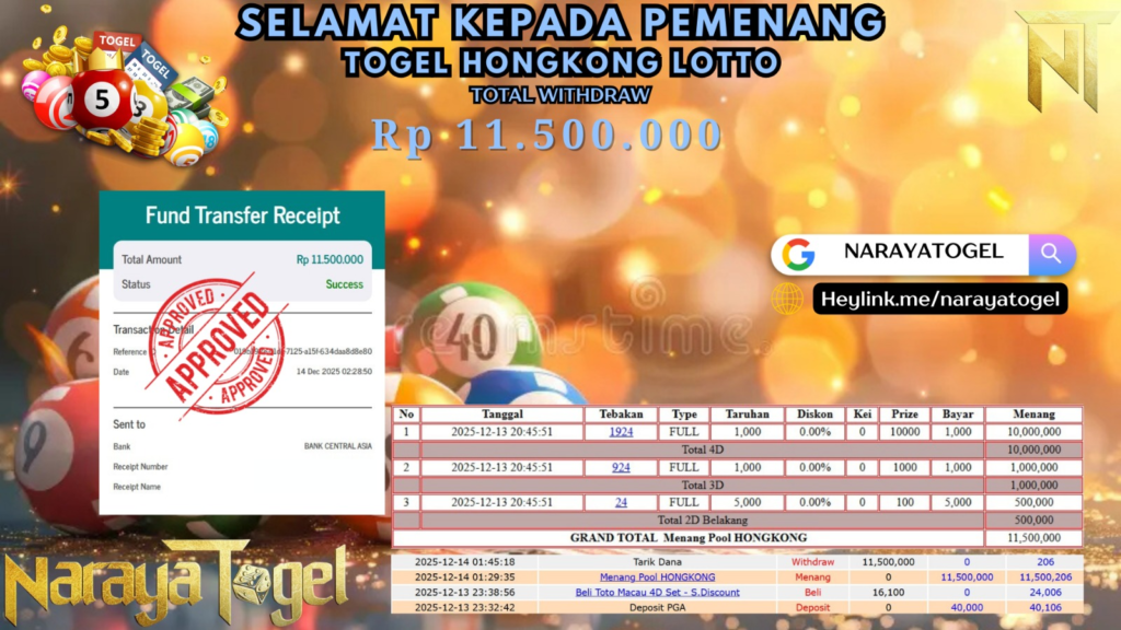 Selamat kepada User id COP**** Telah berhasil mendapatkan kemenangan besar pada permainan TOGEL HONGKONG LOTTO Dengan kemenangan Sebesar Rp 11.500.000 Setelah mengisi formulir withdraw dengan kurang waktu hanya 1 – 10 menit pihak NARAYATOGEL sudah melakukan transfer kepada pemiliknya dan dana sudah masuk ke rekening id tersebut oleh pemenang. Bukti pembayaran yang kami berikan merupakan bukti pembayaran yang SAH / VALID yang langsung di dapatkan melalui tanda transfer transaksi berhasil dari Bank yang di tuju.