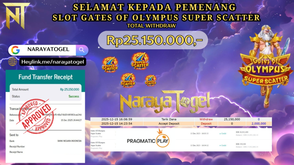 Selamat kepada User id LOP**** Telah berhasil mendapatkan kemenangan besar pada permainan SLOT GATES OF OLYMPUS SUPER SCATTER Dengan kemenangan Sebesar Rp 25.150.000 Setelah mengisi formulir withdraw dengan kurang waktu hanya 1 – 10 menit pihak NARAYATOGEL sudah melakukan transfer kepada pemiliknya dan dana sudah masuk ke rekening id tersebut oleh pemenang. Bukti pembayaran yang kami berikan merupakan bukti pembayaran yang SAH / VALID yang langsung di dapatkan melalui tanda transfer transaksi berhasil dari Bank yang di tuju.