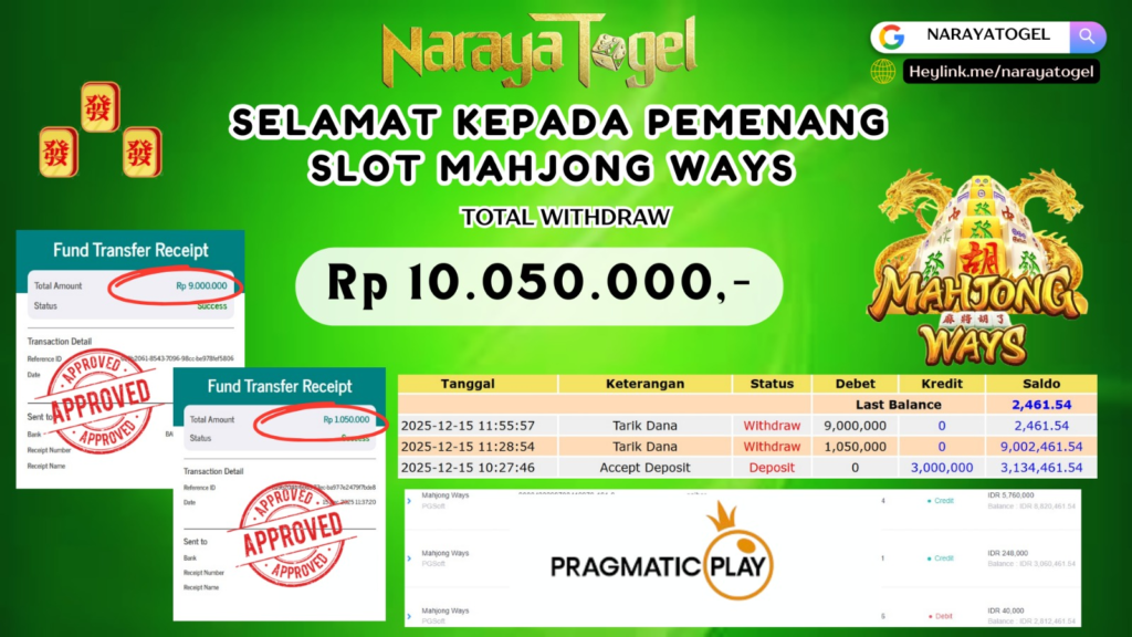 Selamat kepada User id SER**** Telah berhasil mendapatkan kemenangan besar pada permainan SLOT MAHJONG WAYS  Dengan kemenangan Sebesar  Rp 10.050.000 Setelah mengisi formulir withdraw dengan kurang waktu hanya 1 – 10 menit pihak NARAYATOGEL sudah melakukan transfer kepada pemiliknya dan dana sudah masuk ke rekening id tersebut oleh pemenang. Bukti pembayaran yang kami berikan merupakan bukti pembayaran yang SAH / VALID yang langsung di dapatkan melalui tanda transfer transaksi berhasil dari Bank yang di tuju.