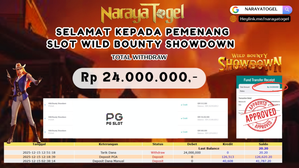 Selamat kepada User id BOP**** Telah berhasil mendapatkan kemenangan besar pada permainan SLOT WILD BOUNTY SHOWDOWN Dengan kemenangan Sebesar Rp 24.000.000 Setelah mengisi formulir withdraw dengan kurang waktu hanya 1 – 10 menit pihak NARAYATOGEL sudah melakukan transfer kepada pemiliknya dan dana sudah masuk ke rekening id tersebut oleh pemenang. Bukti pembayaran yang kami berikan merupakan bukti pembayaran yang SAH / VALID yang langsung di dapatkan melalui tanda transfer transaksi berhasil dari Bank yang di tuju.