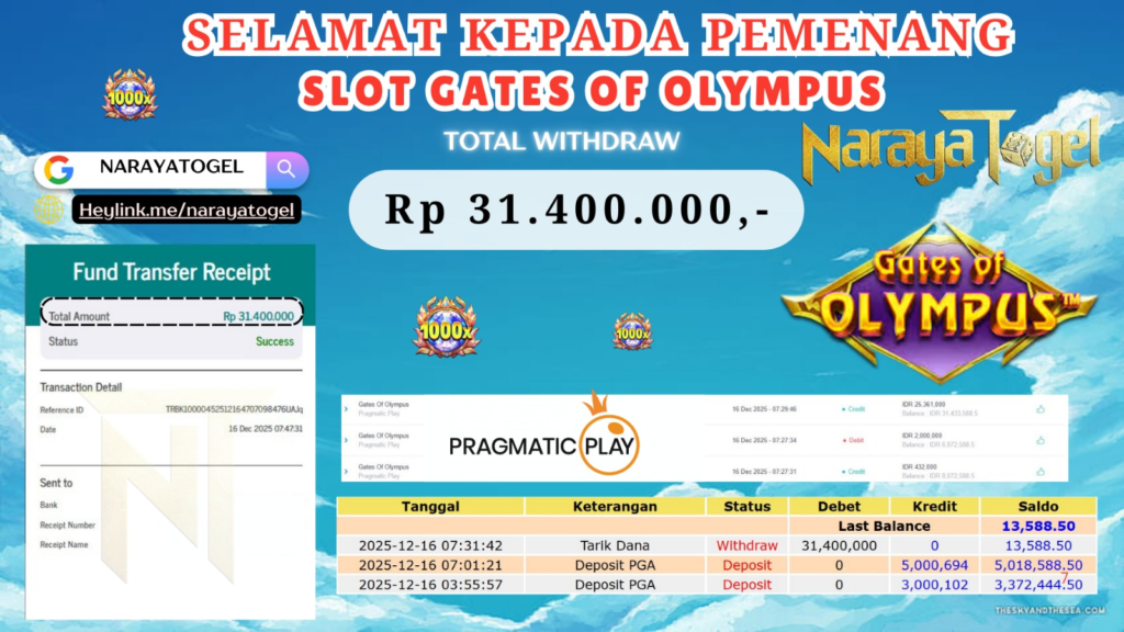 Selamat kepada User id ABAH*** Telah berhasil mendapatkan kemenangan besar pada permainan GATES OF OLYMPUS Dengan kemenangan Sebesar Rp 31.400.000 Setelah mengisi formulir withdraw dengan kurang waktu hanya 1 – 10 menit pihak NARAYATOGEL sudah melakukan transfer kepada pemiliknya dan dana sudah masuk ke rekening id tersebut oleh pemenang. Bukti pembayaran yang kami berikan merupakan bukti pembayaran yang SAH / VALID yang langsung di dapatkan melalui tanda transfer transaksi berhasil dari Bank yang di tuju.