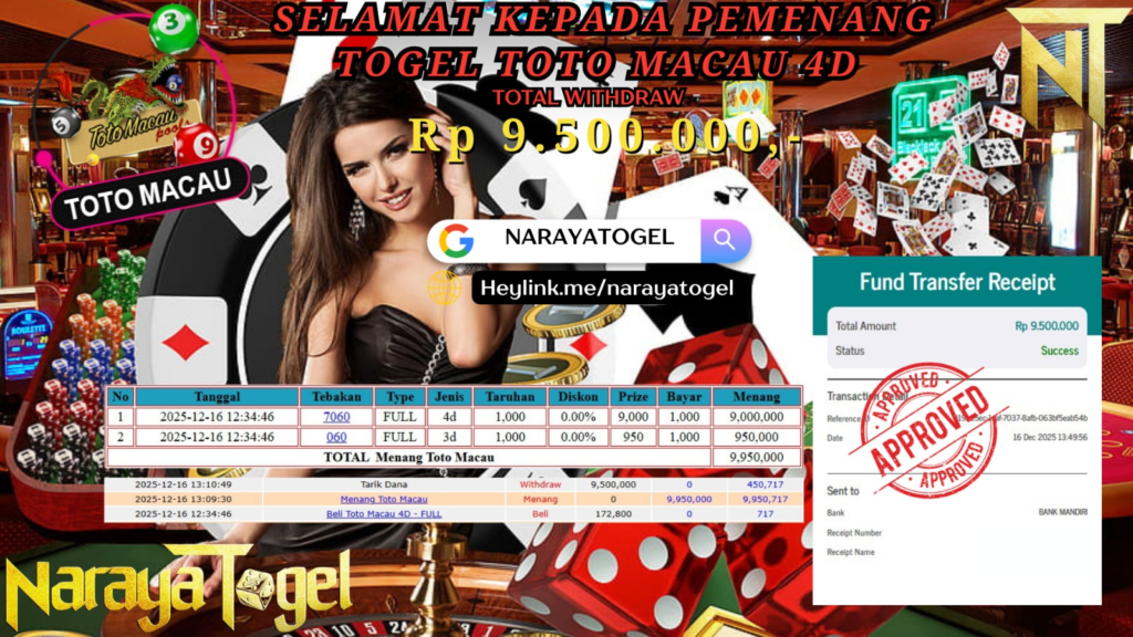 Masih ragu dengan NARAYA TOGEL bos ? Di mana bandar togel online sekarang yang terpercaya seperti NARAYATOGEL ? Bandar yang mengirimkan kemenangan member tanpa bertele – tele. Jadi…. tidak perlu khawatir pada situs NARAYA TOGEL karena kemenangan anda berapapun akan dibayarakan hingga lunas kepada pemenang.