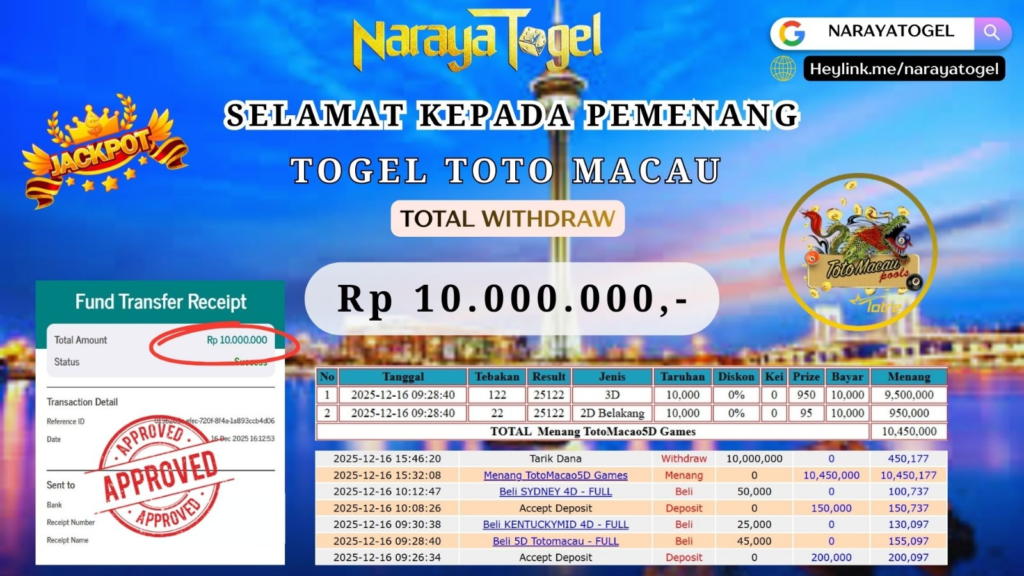 Selamat kepada User id QER**** Telah berhasil mendapatkan kemenangan besar pada permainan TOGEL TOTO MACAU Dengan kemenangan Sebesar Rp 10.000.000 Setelah mengisi formulir withdraw dengan kurang waktu hanya 1 – 10 menit pihak NARAYATOGEL sudah melakukan transfer kepada pemiliknya dan dana sudah masuk ke rekening id tersebut oleh pemenang. Bukti pembayaran yang kami berikan merupakan bukti pembayaran yang SAH / VALID yang langsung di dapatkan melalui tanda transfer transaksi berhasil dari Bank yang di tuju.