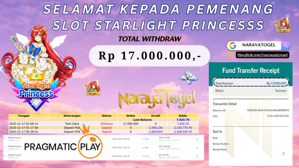 Selamat kepada User id RZA*** Telah berhasil mendapatkan kemenangan besar pada permainan STARLIGHT PRINCESS Dengan kemenangan Sebesar Rp17.000.000 Setelah mengisi formulir withdraw dengan kurang waktu hanya 1 – 10 menit pihak NARAYATOGEL sudah melakukan transfer kepada pemiliknya dan dana sudah masuk ke rekening id tersebut oleh pemenang. Bukti pembayaran yang kami berikan merupakan bukti pembayaran yang SAH / VALID yang langsung di dapatkan melalui tanda transfer transaksi berhasil dari Bank yang di tuju.