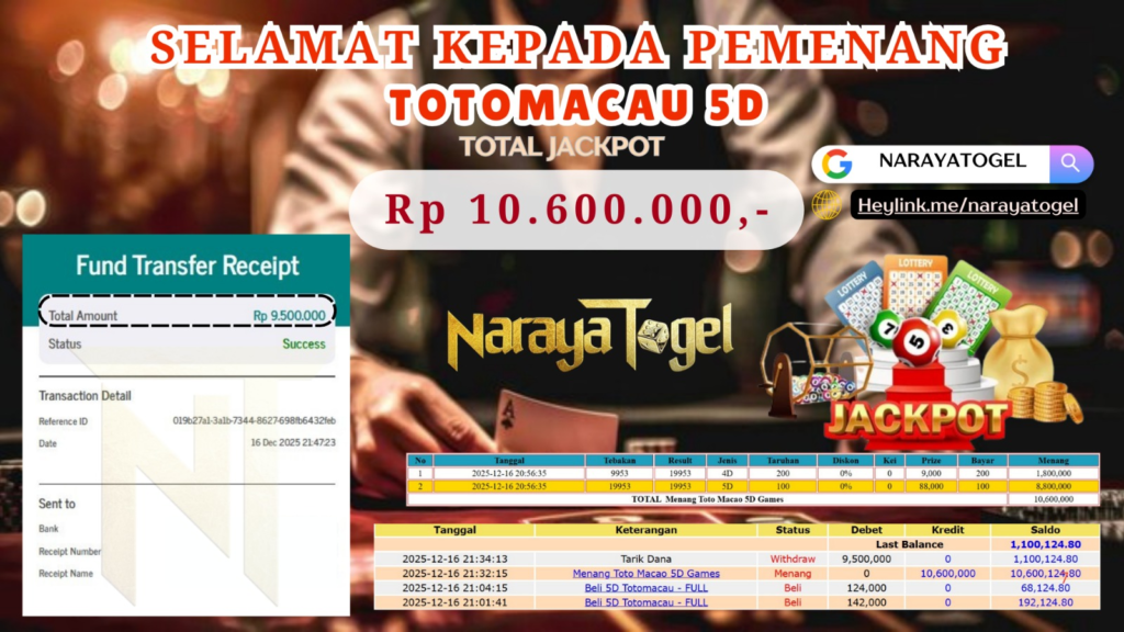 Selamat kepada User id JAU*** Telah berhasil mendapatkan kemenangan besar pada permainan TOTOMACAU 5D Dengan kemenangan Sebesar Rp10.600.000 Setelah mengisi formulir withdraw dengan kurang waktu hanya 1 – 10 menit pihak NARAYATOGEL sudah melakukan transfer kepada pemiliknya dan dana sudah masuk ke rekening id tersebut oleh pemenang. Bukti pembayaran yang kami berikan merupakan bukti pembayaran yang SAH / VALID yang langsung di dapatkan melalui tanda transfer transaksi berhasil dari Bank yang di tuju.