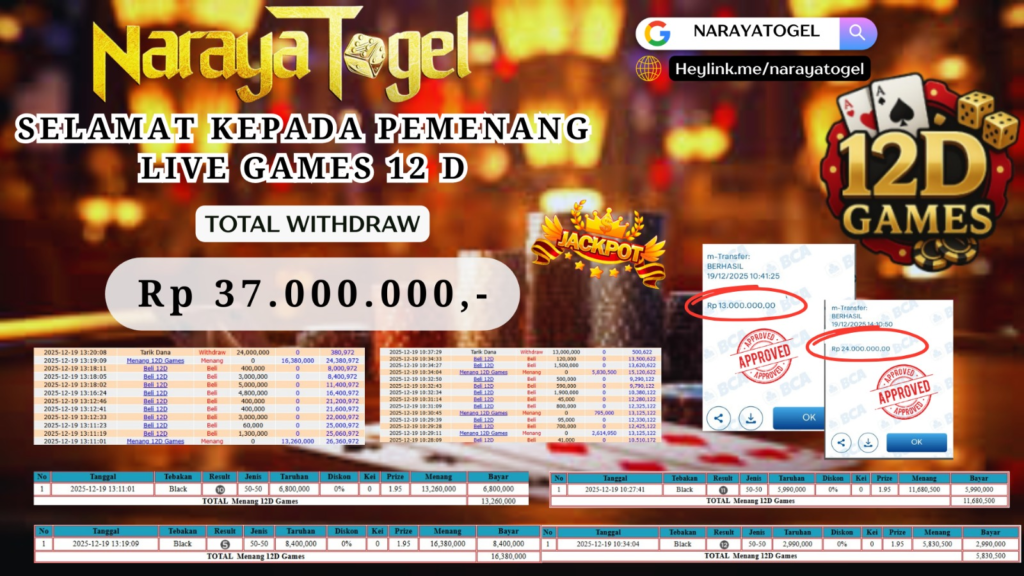 Selamat kepada User id REW*** Telah berhasil mendapatkan kemenangan besar pada permainan LIVE GAMES 12 D Dengan kemenangan Sebesar Rp37.000.000 Setelah mengisi formulir withdraw dengan kurang waktu hanya 1 – 10 menit pihak NARAYATOGEL sudah melakukan transfer kepada pemiliknya dan dana sudah masuk ke rekening id tersebut oleh pemenang. Bukti pembayaran yang kami berikan merupakan bukti pembayaran yang SAH / VALID yang langsung di dapatkan melalui tanda transfer transaksi berhasil dari Bank yang di tuju.