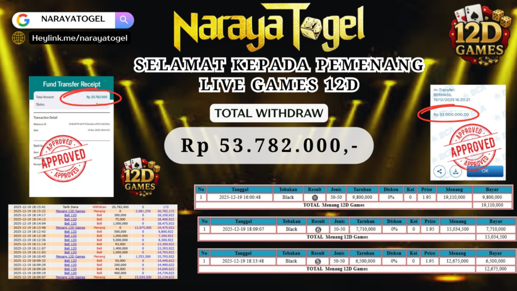 Selamat kepada User id RUI*** Telah berhasil mendapatkan kemenangan besar pada permainan LIVE GAMES 12D Dengan kemenangan Sebesar Rp53.782.000 Setelah mengisi formulir withdraw dengan kurang waktu hanya 1 – 10 menit pihak NARAYATOGEL sudah melakukan transfer kepada pemiliknya dan dana sudah masuk ke rekening id tersebut oleh pemenang. Bukti pembayaran yang kami berikan merupakan bukti pembayaran yang SAH / VALID yang langsung di dapatkan melalui tanda transfer transaksi berhasil dari Bank yang di tuju.