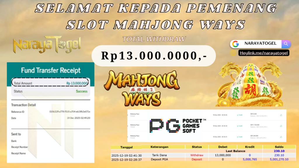 Selamat kepada User id YUNN*** Telah berhasil mendapatkan kemenangan besar pada permainan SLOT MAHJONG WAYS Dengan kemenangan Sebesar  Rp13.000.000 Setelah mengisi formulir withdraw dengan kurang waktu hanya 1 – 10 menit pihak NARAYATOGEL sudah melakukan transfer kepada pemiliknya dan dana sudah masuk ke rekening id tersebut oleh pemenang. Bukti pembayaran yang kami berikan merupakan bukti pembayaran yang SAH / VALID yang langsung di dapatkan melalui tanda transfer transaksi berhasil dari Bank yang di tuju.