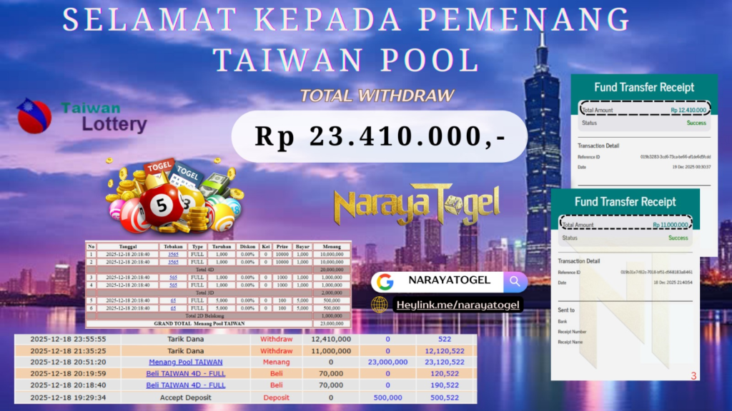 Selamat kepada User id ZEF*** Telah berhasil mendapatkan kemenangan besar pada permainan TAIWAN POOL  Dengan kemenangan Sebesar  Rp23.410.000 Setelah mengisi formulir withdraw dengan kurang waktu hanya 1 – 10 menit pihak NARAYATOGEL sudah melakukan transfer kepada pemiliknya dan dana sudah masuk ke rekening id tersebut oleh pemenang. Bukti pembayaran yang kami berikan merupakan bukti pembayaran yang SAH / VALID yang langsung di dapatkan melalui tanda transfer transaksi berhasil dari Bank yang di tuju.