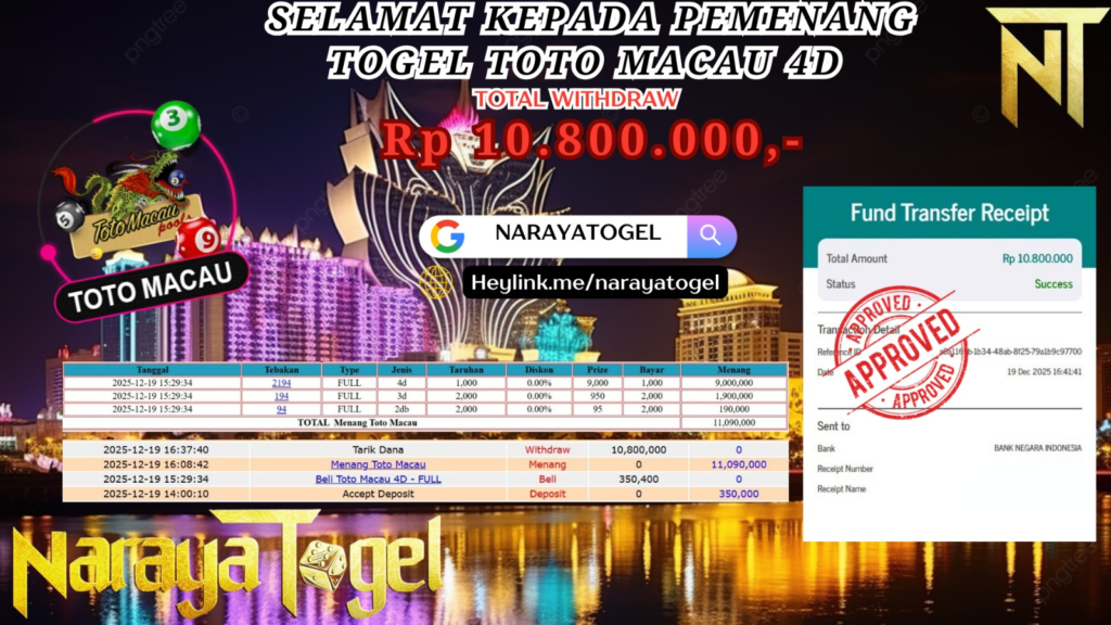 NARAYATOGEL adalah Situs Togel Online & Slot Online di Indonesia. Dengan menyediakan berbagai macam permainan yang seru dan menarik di NARAYATOGEL NARAYATOGEL memberikan kemudahan akses, mulai dari proses login yang cepat hingga berbagai fitur lengkap untuk mempermudah pemain dalam memprediksi dan mengecek hasil togel. Dengan layanan pelanggan yang siap membantu 24 jam sehari, NARAYATOGEL menjamin pengalaman bermain yang nyaman, aman, dan menyenangkan. Tersedia berbagai jenis permainan seperti NARAYATOGELNARAYASLOT dan NARAYALIVEGAME dengan peluang menang yang besar.