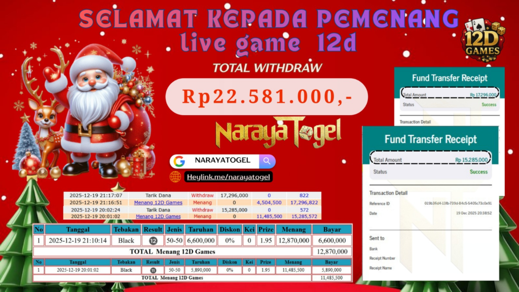 Selamat kepada User id CUM*** Telah berhasil mendapatkan kemenangan besar pada permainan LIVE GAMES 12D Dengan kemenangan Sebesar Rp 22.581.000 Setelah mengisi formulir withdraw dengan kurang waktu hanya 1 – 10 menit pihak NARAYATOGEL sudah melakukan transfer kepada pemiliknya dan dana sudah masuk ke rekening id tersebut oleh pemenang. Bukti pembayaran yang kami berikan merupakan bukti pembayaran yang SAH / VALID yang langsung di dapatkan melalui tanda transfer transaksi berhasil dari Bank yang di tuju.
