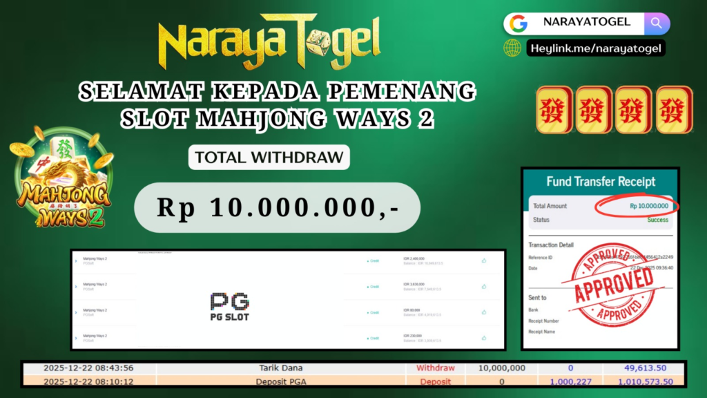 Selamat kepada User id OPK*** Telah berhasil mendapatkan kemenangan besar pada permainan SLOT MAHJONG WAYS 2 Dengan kemenangan Sebesar  Rp10.000.000 Setelah mengisi formulir withdraw dengan kurang waktu hanya 1 – 10 menit pihak NARAYATOGEL sudah melakukan transfer kepada pemiliknya dan dana sudah masuk ke rekening id tersebut oleh pemenang. Bukti pembayaran yang kami berikan merupakan bukti pembayaran yang SAH / VALID yang langsung di dapatkan melalui tanda transfer transaksi berhasil dari Bank yang di tuju.