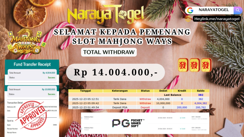 Selamat kepada User id MRE*** Telah berhasil mendapatkan kemenangan besar pada permainan SLOT MAHJONG WAYS Dengan kemenangan Sebesar Rp14.004.000 Setelah mengisi formulir withdraw dengan kurang waktu hanya 1 – 10 menit pihak NARAYATOGEL sudah melakukan transfer kepada pemiliknya dan dana sudah masuk ke rekening id tersebut oleh pemenang. Bukti pembayaran yang kami berikan merupakan bukti pembayaran yang SAH / VALID yang langsung di dapatkan melalui tanda transfer transaksi berhasil dari Bank yang di tuju.