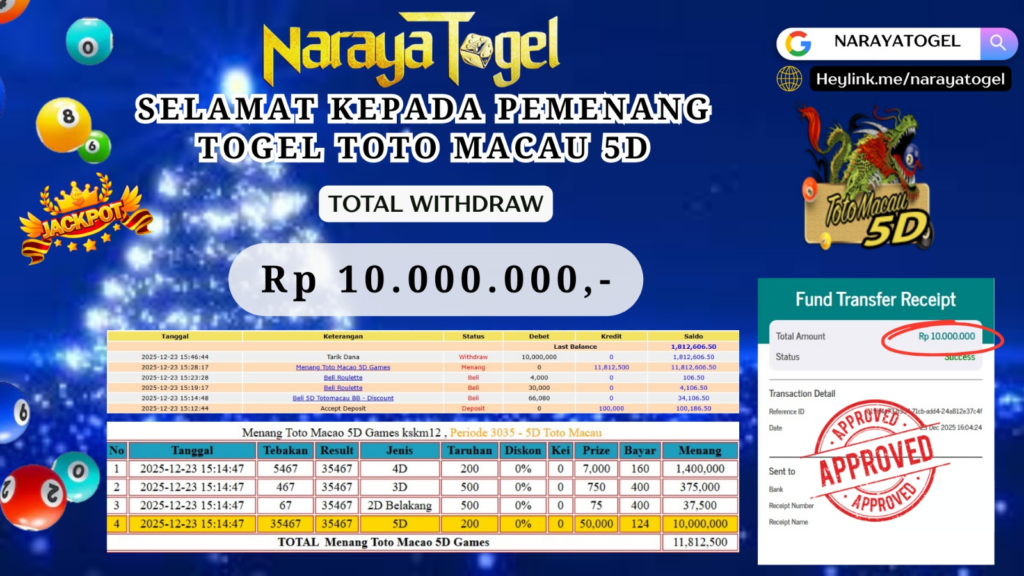 Selamat kepada User id BMK*** Telah berhasil mendapatkan kemenangan besar pada permainan TOGEL TOTO MACAU 5D    Dengan kemenangan Sebesar  Rp10.000.000 Setelah mengisi formulir withdraw dengan kurang waktu hanya 1 – 10 menit pihak NARAYATOGEL sudah melakukan transfer kepada pemiliknya dan dana sudah masuk ke rekening id tersebut oleh pemenang. Bukti pembayaran yang kami berikan merupakan bukti pembayaran yang SAH / VALID yang langsung di dapatkan melalui tanda transfer transaksi berhasil dari Bank yang di tuju.