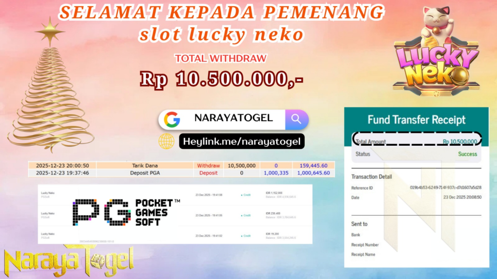 Selamat kepada User id LIKE*** Telah berhasil mendapatkan kemenangan besar pada permainan SLOT LUCKY NEKO Dengan kemenangan Sebesar Rp10.500.000 Setelah mengisi formulir withdraw dengan kurang waktu hanya 1 – 10 menit pihak NARAYATOGEL sudah melakukan transfer kepada pemiliknya dan dana sudah masuk ke rekening id tersebut oleh pemenang. Bukti pembayaran yang kami berikan merupakan bukti pembayaran yang SAH / VALID yang langsung di dapatkan melalui tanda transfer transaksi berhasil dari Bank yang di tuju.