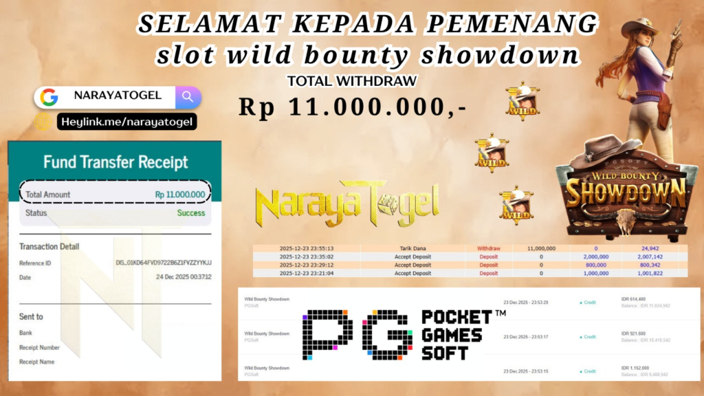 Selamat kepada User id TARA*** Telah berhasil mendapatkan kemenangan besar pada permainan WILD BOUNTY SHOWDOWN Dengan kemenangan Sebesar Rp 11.000.000 Setelah mengisi formulir withdraw dengan kurang waktu hanya 1 – 10 menit pihak NARAYATOGEL sudah melakukan transfer kepada pemiliknya dan dana sudah masuk ke rekening id tersebut oleh pemenang. Bukti pembayaran yang kami berikan merupakan bukti pembayaran yang SAH / VALID yang langsung di dapatkan melalui tanda transfer transaksi berhasil dari Bank yang di tuju.