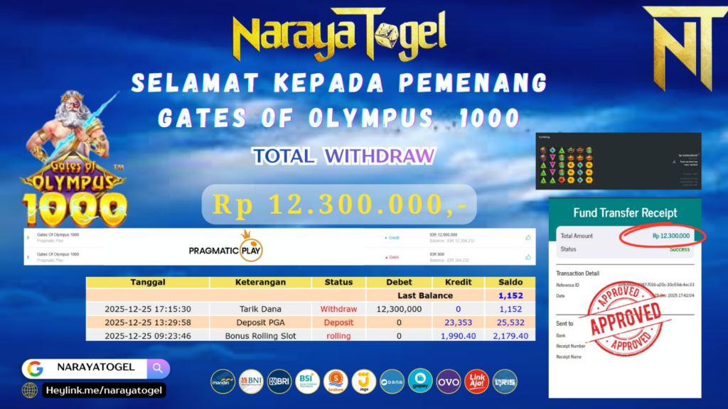Selamat kepada User id DWE*** Telah berhasil mendapatkan kemenangan besar pada permainan SLOT GATES OF OLYMPUS 1000 Dengan kemenangan Sebesar  Rp12.300.000 Setelah mengisi formulir withdraw dengan kurang waktu hanya 1 – 10 menit pihak NARAYATOGEL sudah melakukan transfer kepada pemiliknya dan dana sudah masuk ke rekening id tersebut oleh pemenang. Bukti pembayaran yang kami berikan merupakan bukti pembayaran yang SAH / VALID yang langsung di dapatkan melalui tanda transfer transaksi berhasil dari Bank yang di tuju.