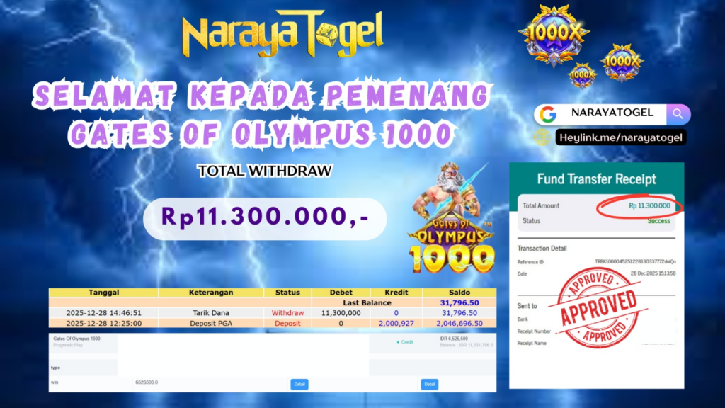 Selamat kepada User id LOP*** Telah berhasil mendapatkan kemenangan besar pada permainan GATES OF OLYMPUS 1000 Dengan kemenangan Sebesar Rp11.300.000 Setelah mengisi formulir withdraw dengan kurang waktu hanya 1 – 10 menit pihak NARAYATOGEL sudah melakukan transfer kepada pemiliknya dan dana sudah masuk ke rekening id tersebut oleh pemenang. Bukti pembayaran yang kami berikan merupakan bukti pembayaran yang SAH / VALID yang langsung di dapatkan melalui tanda transfer transaksi berhasil dari Bank yang di tuju.