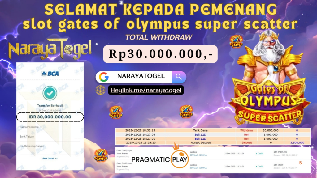 Selamat kepada User id IKHS*** Telah berhasil mendapatkan kemenangan besar pada permainan GATES OF OLYMPUS SUPER SCATTER Dengan kemenangan Sebesar Rp30.000.000 Setelah mengisi formulir withdraw dengan kurang waktu hanya 1 – 10 menit pihak NARAYATOGEL sudah melakukan transfer kepada pemiliknya dan dana sudah masuk ke rekening id tersebut oleh pemenang. Bukti pembayaran yang kami berikan merupakan bukti pembayaran yang SAH / VALID yang langsung di dapatkan melalui tanda transfer transaksi berhasil dari Bank yang di tuju.