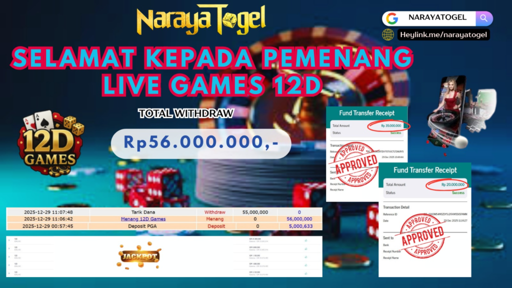 Selamat kepada User id HPO*** Telah berhasil mendapatkan kemenangan besar pada permainan GALIVE GAMES 12D Dengan kemenangan Sebesar Rp56.000.000 Setelah mengisi formulir withdraw dengan kurang waktu hanya 1 – 10 menit pihak NARAYATOGEL sudah melakukan transfer kepada pemiliknya dan dana sudah masuk ke rekening id tersebut oleh pemenang. Bukti pembayaran yang kami berikan merupakan bukti pembayaran yang SAH / VALID yang langsung di dapatkan melalui tanda transfer transaksi berhasil dari Bank yang di tuju.