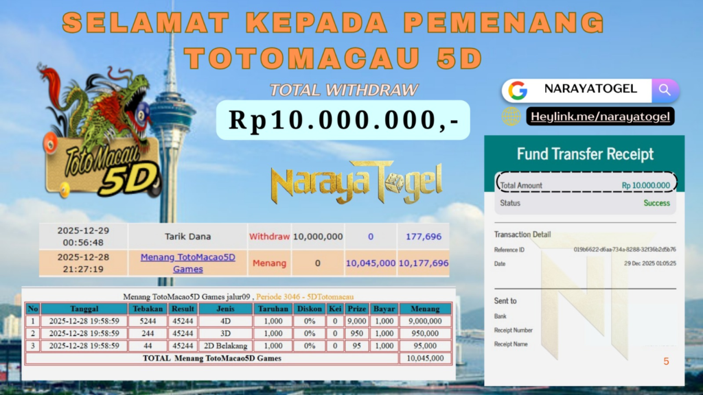 Selamat kepada User id DAV*** Telah berhasil mendapatkan kemenangan besar pada permainan TOTOMACAU 5D   Dengan kemenangan Sebesar  Rp10.000.000 Setelah mengisi formulir withdraw dengan kurang waktu hanya 1 – 10 menit pihak NARAYATOGEL sudah melakukan transfer kepada pemiliknya dan dana sudah masuk ke rekening id tersebut oleh pemenang. Bukti pembayaran yang kami berikan merupakan bukti pembayaran yang SAH / VALID yang langsung di dapatkan melalui tanda transfer transaksi berhasil dari Bank yang di tuju.