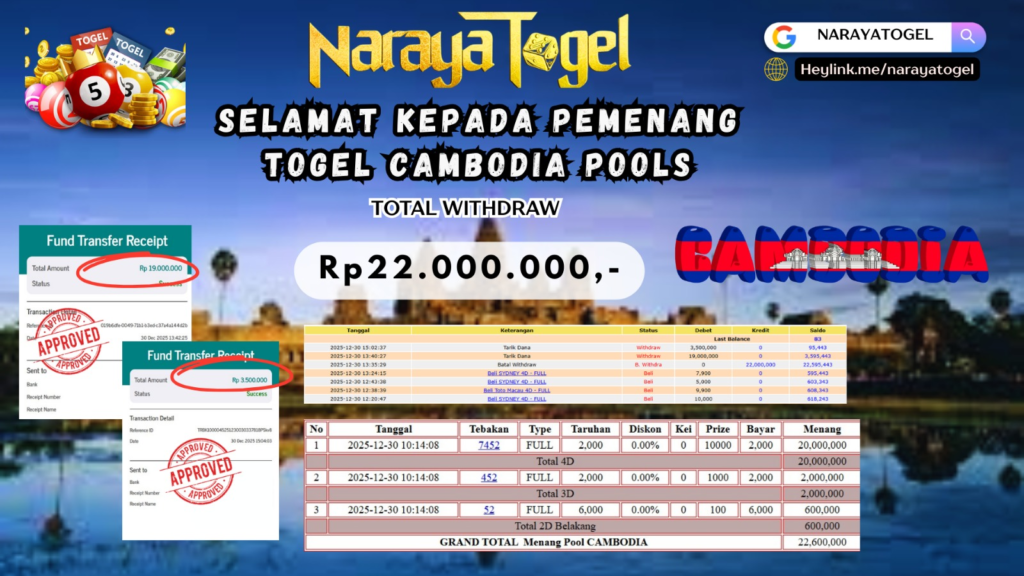 Selamat kepada User id BOP*** Telah berhasil mendapatkan kemenangan besar pada permainan TOGEL CAMBODIA POOLS Dengan kemenangan Sebesar Rp22.000.000 Setelah mengisi formulir withdraw dengan kurang waktu hanya 1 – 10 menit pihak NARAYATOGEL sudah melakukan transfer kepada pemiliknya dan dana sudah masuk ke rekening id tersebut oleh pemenang. Bukti pembayaran yang kami berikan merupakan bukti pembayaran yang SAH / VALID yang langsung di dapatkan melalui tanda transfer transaksi berhasil dari Bank yang di tuju.