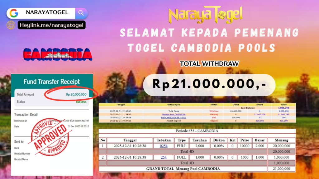 Selamat kepada User id HLO*** Telah berhasil mendapatkan kemenangan besar pada permainan TOGEL CAMBODIA POOLS Dengan kemenangan Sebesar Rp 21.000.000 Setelah mengisi formulir withdraw dengan kurang waktu hanya 1 – 10 menit pihak NARAYATOGEL sudah melakukan transfer kepada pemiliknya dan dana sudah masuk ke rekening id tersebut oleh pemenang. Bukti pembayaran yang kami berikan merupakan bukti pembayaran yang SAH / VALID yang langsung di dapatkan melalui tanda transfer transaksi berhasil dari Bank yang di tuju.