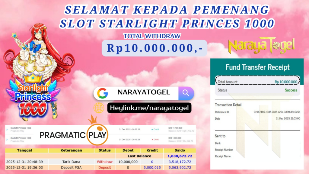 Selamat kepada User id TRIY*** Telah berhasil mendapatkan kemenangan besar pada permainan STARLIGHT PRINCES 1000 Dengan kemenangan Sebesar Rp10.000.000 Setelah mengisi formulir withdraw dengan kurang waktu hanya 1 – 10 menit pihak NARAYATOGEL sudah melakukan transfer kepada pemiliknya dan dana sudah masuk ke rekening id tersebut oleh pemenang. Bukti pembayaran yang kami berikan merupakan bukti pembayaran yang SAH / VALID yang langsung di dapatkan melalui tanda transfer transaksi berhasil dari Bank yang di tuju.